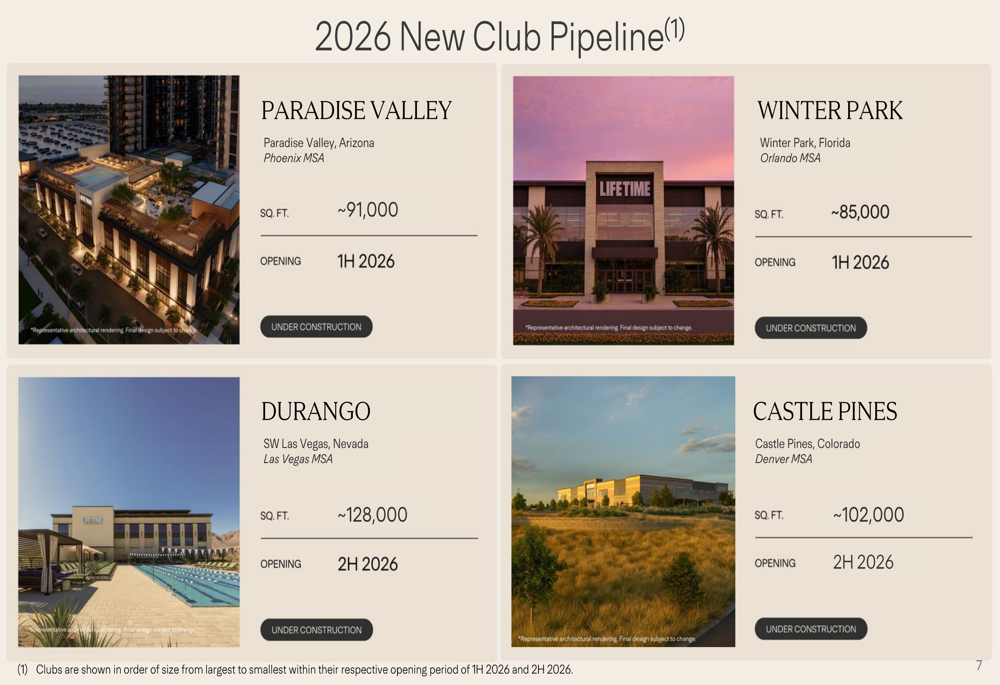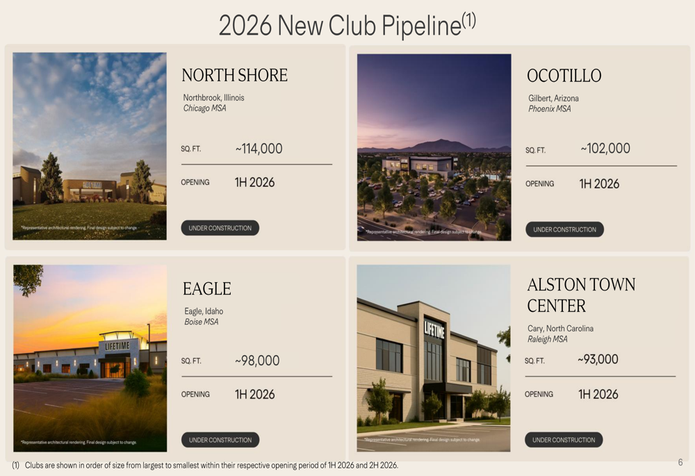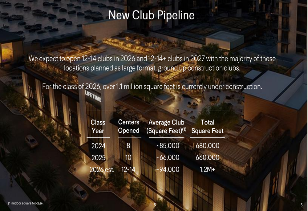 Life Time announced an acceleration of its club opening plans, increasing its target from 10-12 to 12-14 new clubs annually for 2026 and beyond. The company already has 13 clubs under construction for the 2026 class, representing over 1.2 million square feet of new premium fitness space.