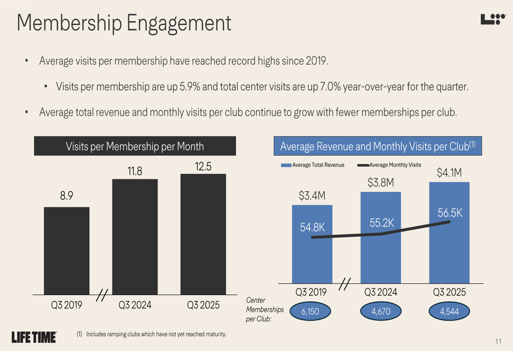 Member engagement metrics further validate Life Time's premium strategy, with significant increases in visits per membership and revenue per club: