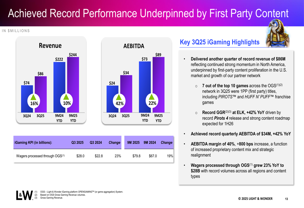 The iGaming segment was the standout performer, with revenue growing 16% year-over-year to $86 million and AEBITDA surging 42% to $34 million. The company noted that seven out of the top ten games across its Open Gaming System (OGS) network were first-party titles, highlighting the success of its content strategy.