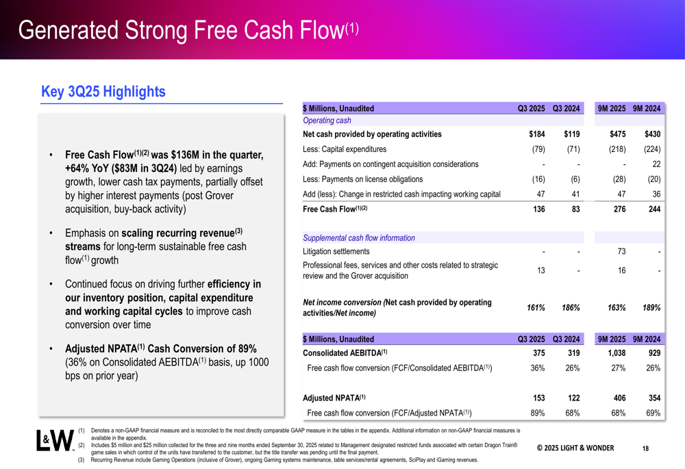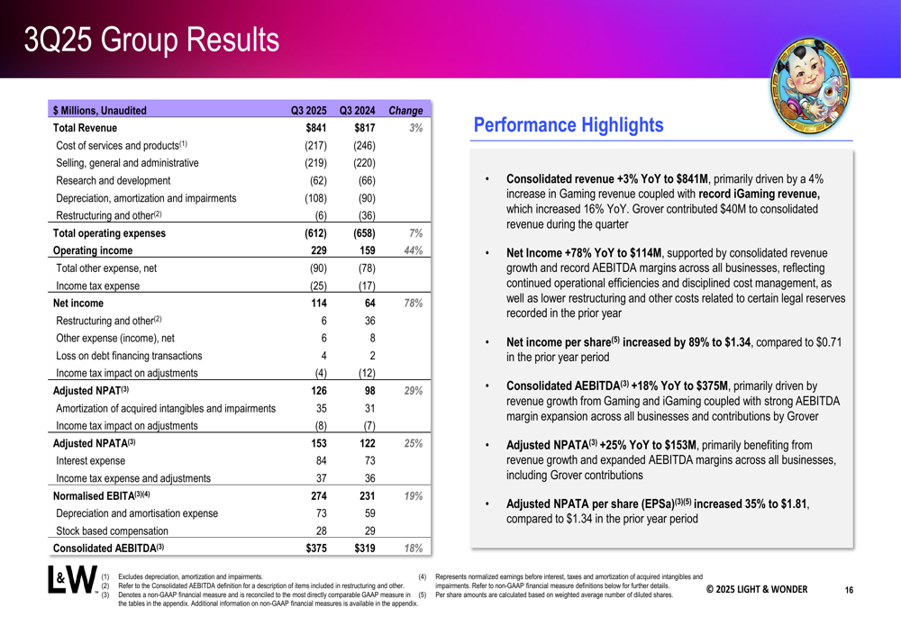 Light & Wonder’s consolidated financial results showed significant improvement in profitability metrics, with net income increasing 78% year-over-year: