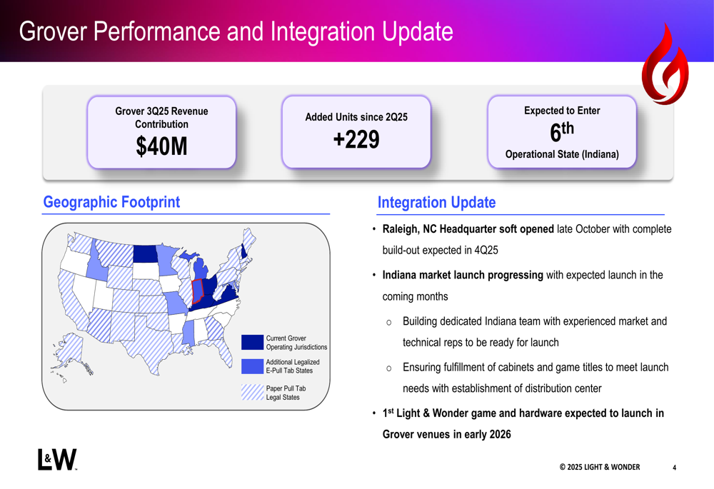 The integration of Grover Gaming, a charitable gaming company that Light & Wonder recently acquired, is progressing well. Grover contributed $40 million to Light & Wonder’s Q3 revenue and added 229 units since Q2. The company is preparing to enter its sixth operational state (Indiana) and opened its Raleigh, NC headquarters in late October.
