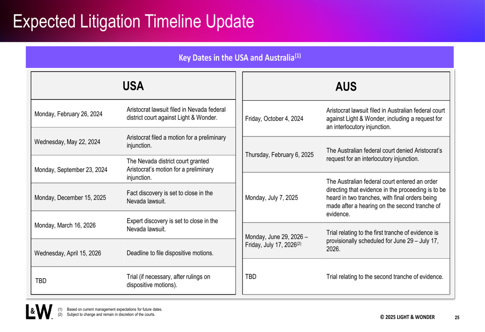 The company provided an update on its ongoing litigation with Aristocrat in both the USA and Australia, outlining expected timelines for discovery, motions, and trial: