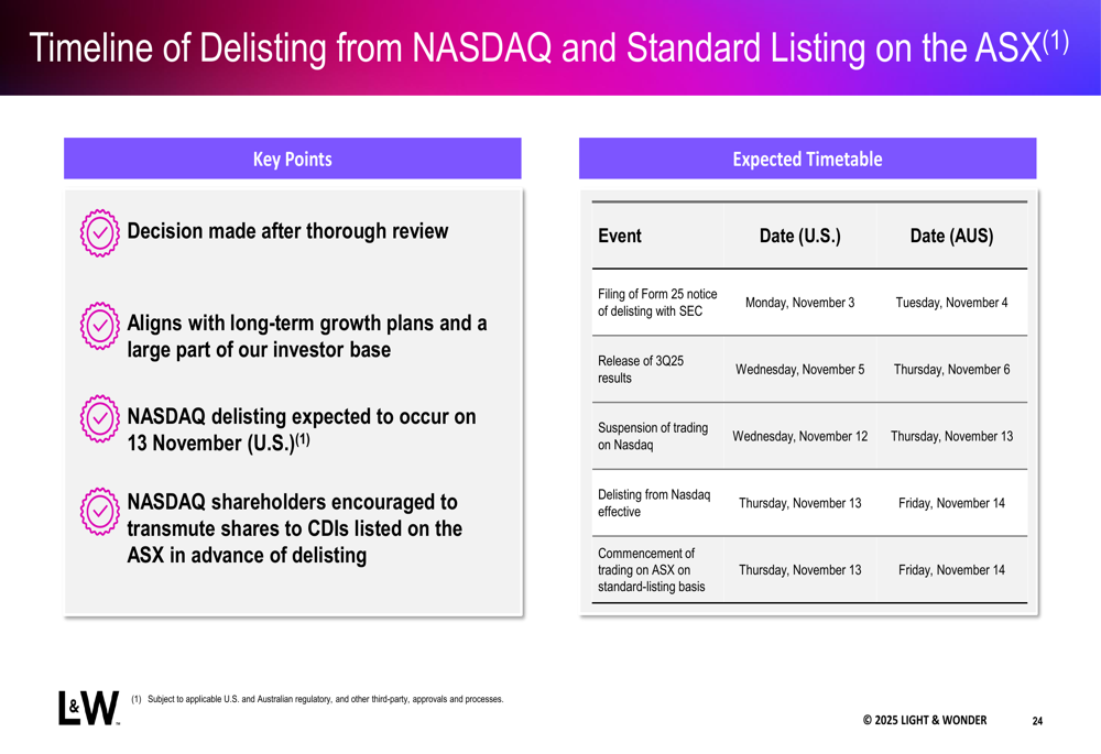 Light & Wonder is also transitioning from NASDAQ to a primary ASX listing, with the NASDAQ delisting expected to be effective on November 14, 2025. This strategic move aligns with the company’s global growth strategy and could potentially broaden its investor base.