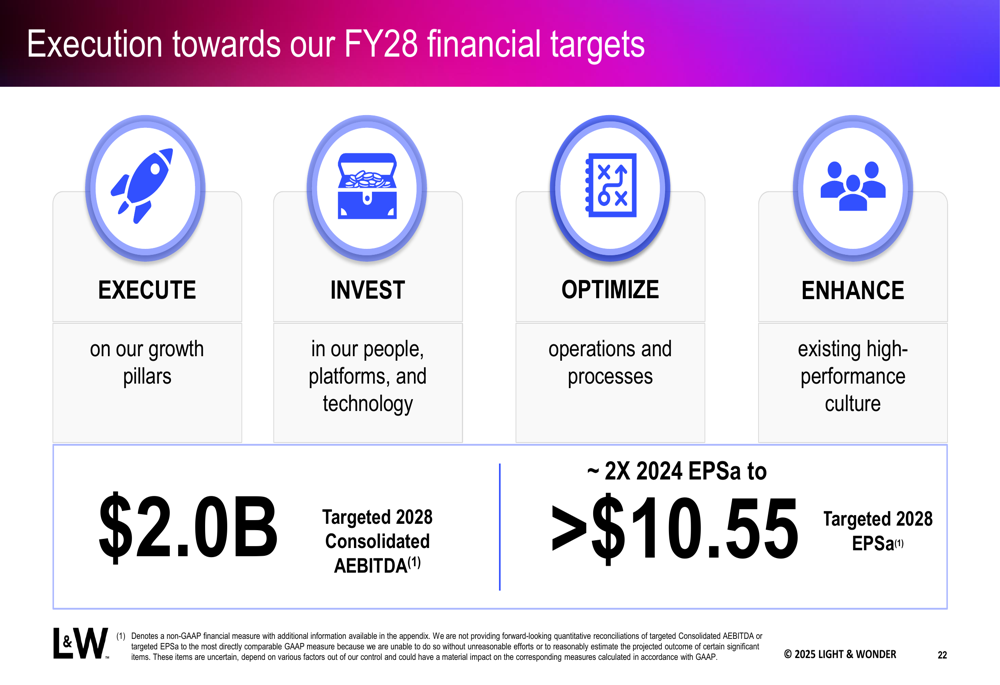 Looking ahead, Light & Wonder has set ambitious financial targets for FY28, including consolidated AEBITDA of $2.0 billion and EPSa of $10.55. The company plans to achieve these targets by executing on growth pillars across its complementary verticals, investing in people and technology, optimizing operations, and enhancing its high-performance culture.
