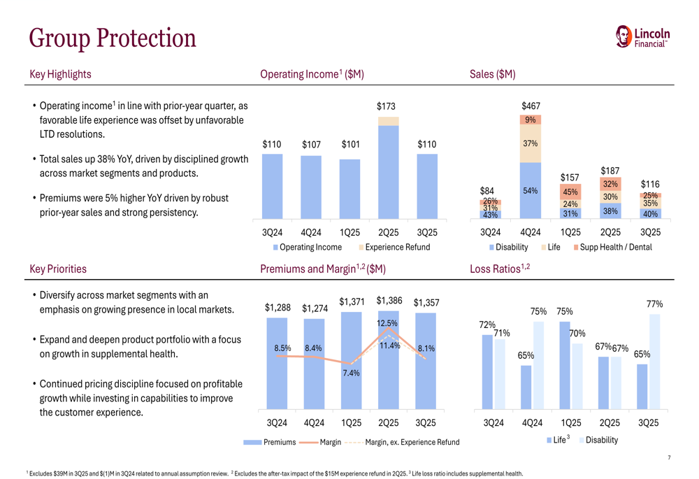The Group Protection segment maintained steady performance with operating income of $110 million, in line with the prior-year quarter. Favorable life experience was a primary driver, though this was offset by negative long-term disability resolutions. Total sales in this segment increased by 38% year-over-year, and premiums grew by 5%.