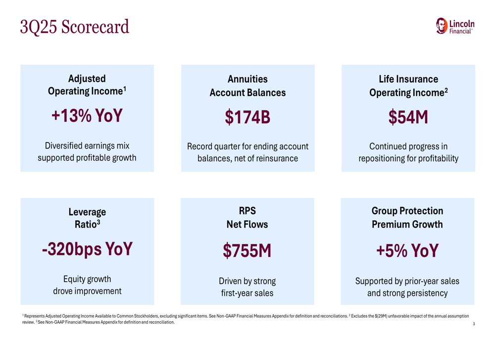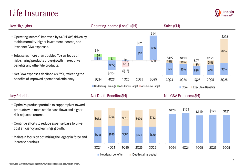 Life Insurance showed the most dramatic improvement, with operating income nearly quadrupling from $14 million in Q3 2024 to $54 million in Q3 2025. This growth was attributed to stable mortality experience, higher investment income, and lower net G&A expenses. Sales in this segment more than doubled year-over-year, primarily driven by executive benefits.