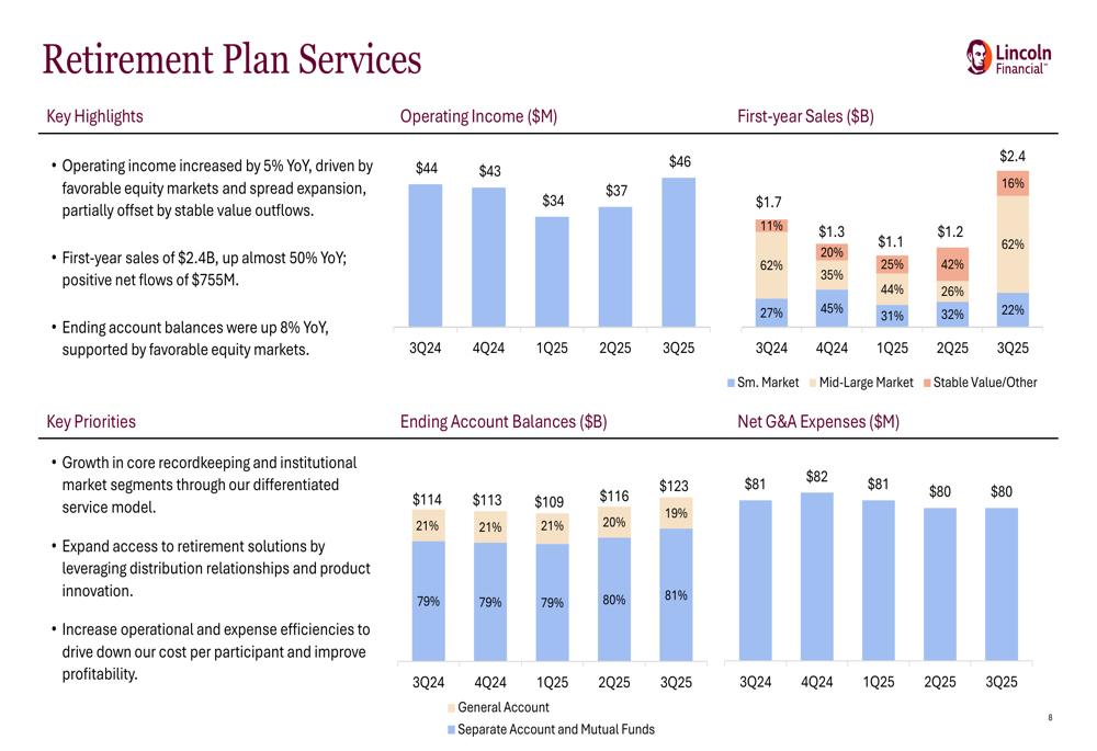 Retirement Plan Services reported a 5% year-over-year increase in operating income to $46 million, supported by favorable equity markets and spread expansion. First-year sales reached $2.4 billion, up almost 50% year-over-year, and ending account balances increased by 8%.