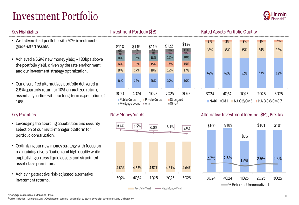 The investment portfolio remains well-diversified with 97% investment-grade-rated assets. The company achieved a 5.9% new money yield during the quarter, while its alternatives portfolio delivered a 2.5% quarterly return.