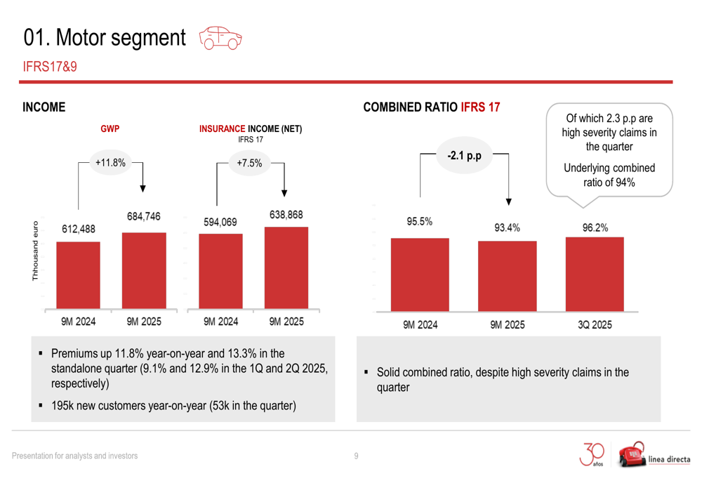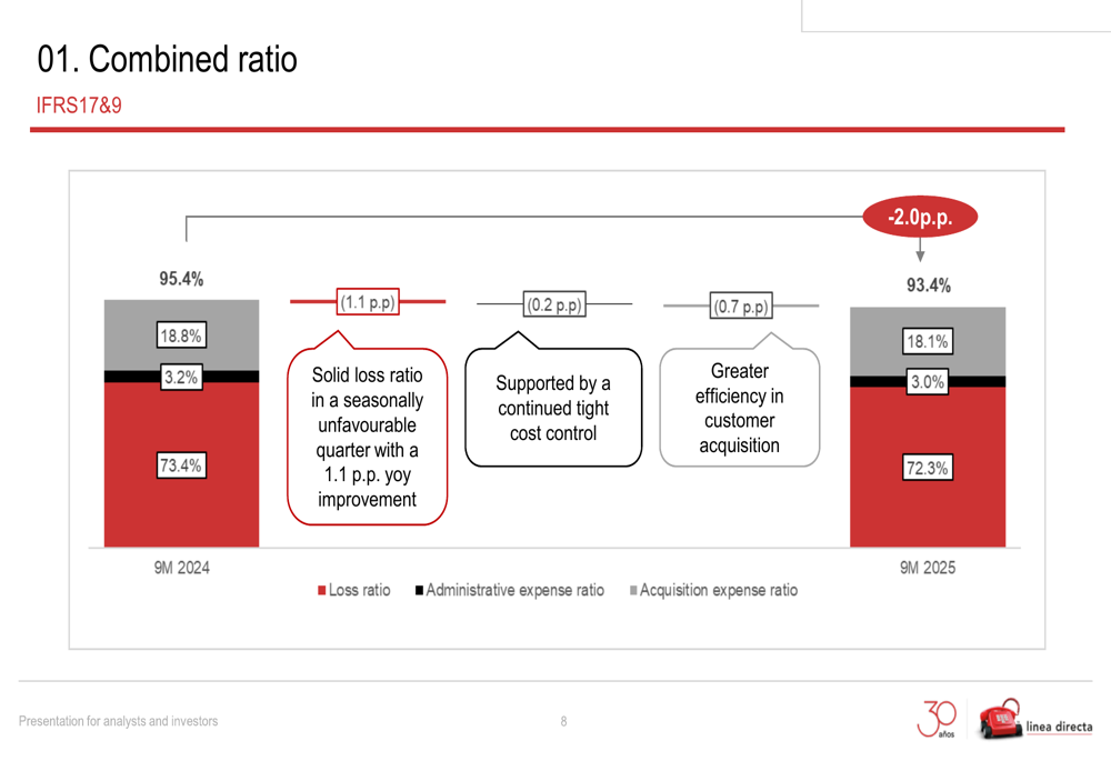 The improvement in Línea Directa’s combined ratio was driven by better loss experience and increased operational efficiency. The company maintained tight cost control and achieved greater efficiency in customer acquisition, resulting in a 0.2 percentage point reduction in the administrative expense ratio and a 0.7 percentage point decrease in the acquisition expense ratio.