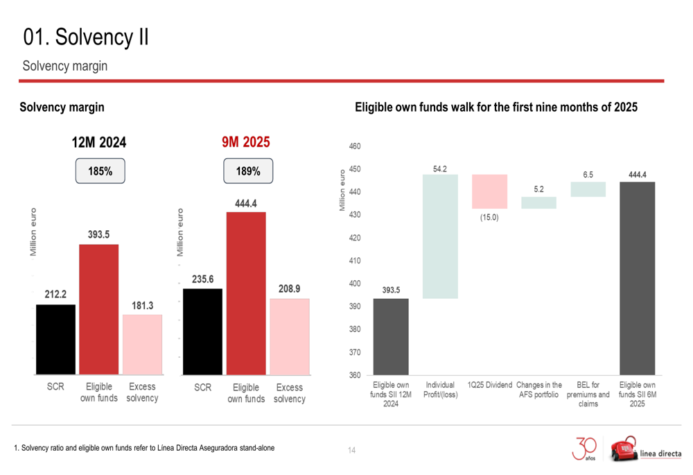 Línea Directa maintained a strong solvency position, with a Solvency II ratio of 189% as of 9M 2025, up from 185% at the end of 2024. This improvement reflects the company’s strong profitability and prudent capital management.