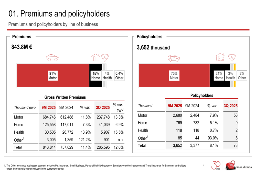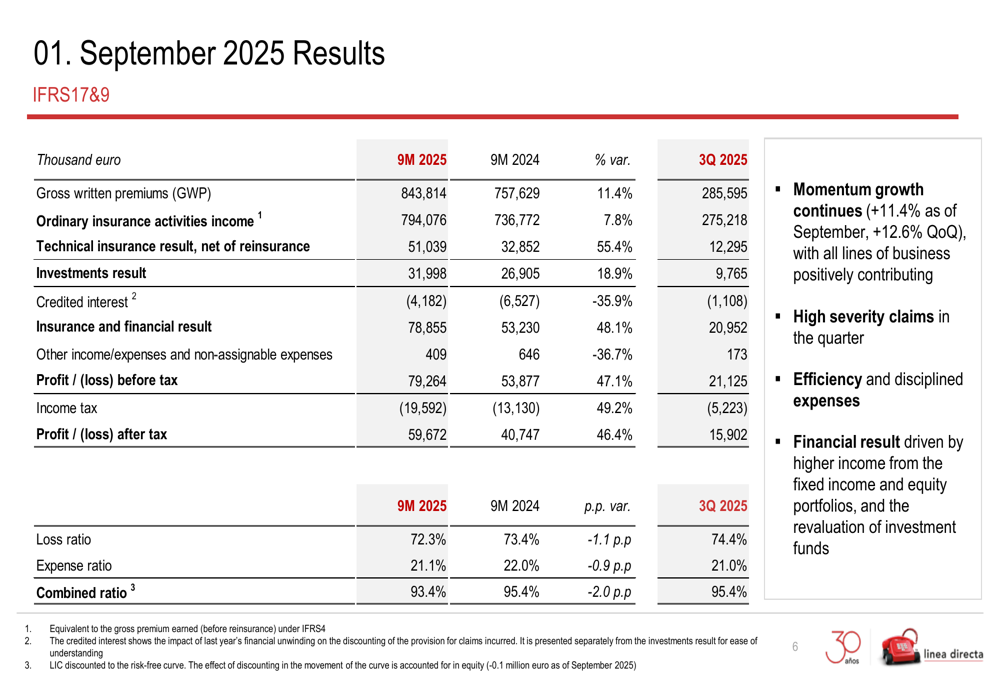 Línea Directa delivered impressive financial performance for the first nine months of 2025, with gross written premiums (GWP) reaching €843.8 million, up 11.4% compared to the same period last year. Net income surged 46.4% year-over-year to €59.7 million, while the company’s portfolio expanded to 3.65 million policies, representing an 8.1% increase.
