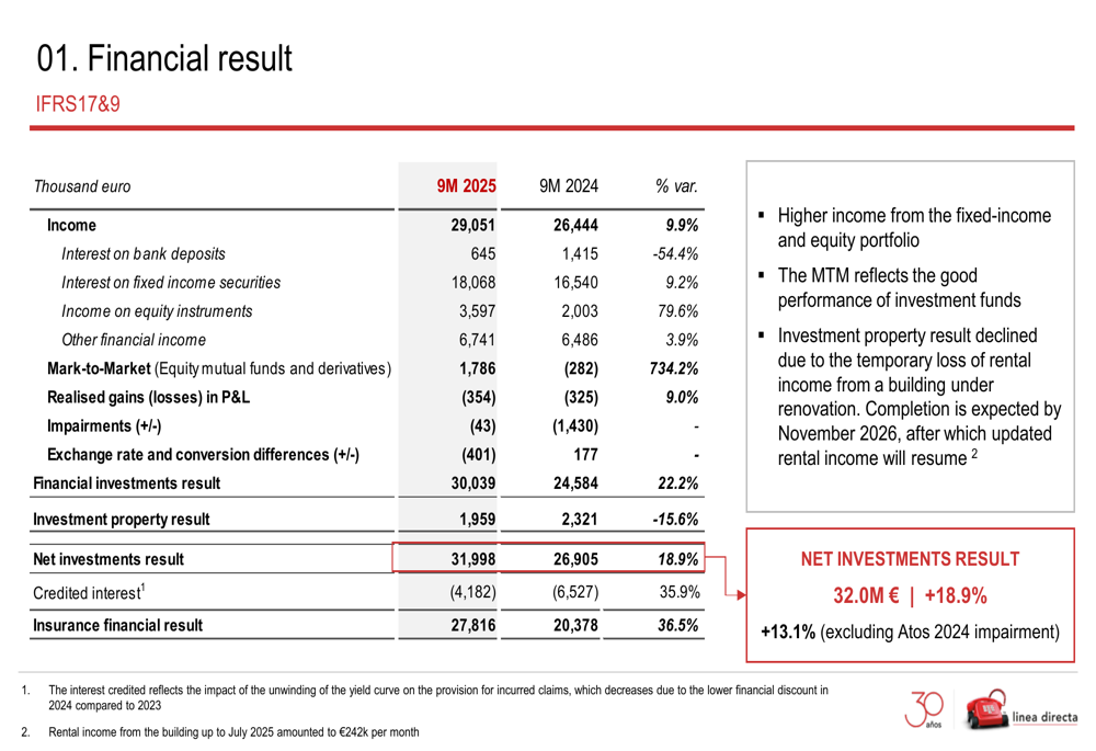Línea Directa’s investment portfolio delivered strong results, with the net investment result increasing by 18.9% to €32 million. This was driven by higher income from the fixed-income and equity portfolio, as well as good performance of investment funds.