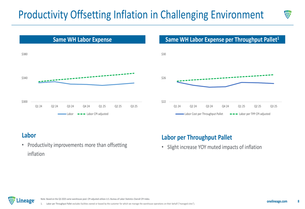 To counter these headwinds, Lineage is focusing on productivity improvements and operational efficiency. The company has implemented labor management initiatives and energy efficiency measures that are helping to offset inflation pressures. As demonstrated in the following chart, productivity improvements are more than offsetting inflation in labor costs: