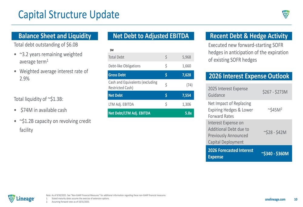 The company also executed new forward-starting SOFR hedges in anticipation of the expiration of existing hedges. Looking ahead to 2026, Lineage forecasts interest expenses to increase to approximately $340-360 million, up from the 2025 guidance of $267-273 million, due to replacing expiring hedges and additional debt from capital deployment.