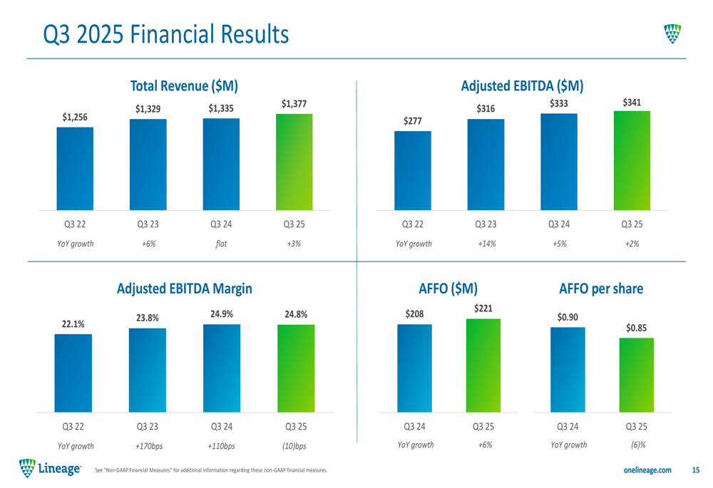Lineage's Q3 2025 results showed a mixed performance across key metrics. While total revenue increased 3% year-over-year and adjusted EBITDA grew 2%, AFFO per share declined 6% compared to the same period last year. The company noted that prior year AFFO per share was affected by an intra-quarter IPO in Q3 2024.