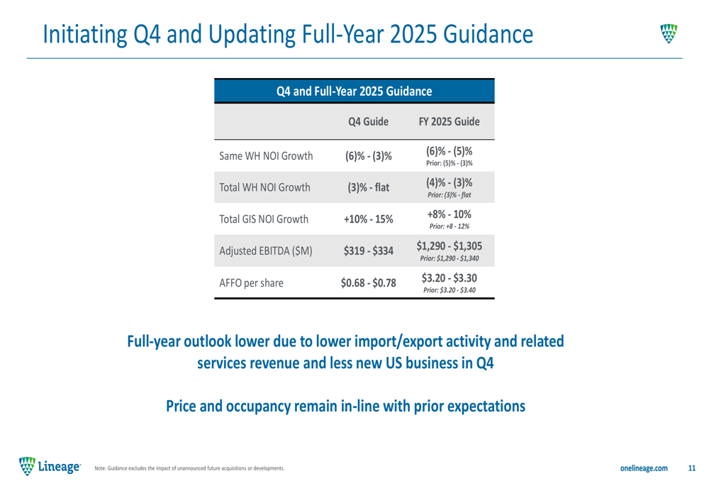 Lineage has adjusted its full-year 2025 guidance to the lower end of its previous range, citing decreased import/export activity and less new US business in Q4. The company now expects adjusted EBITDA between $1,290-$1,305 million (previously $1,290-$1,340 million) and AFFO per share of $3.20-$3.30 (previously $3.20-$3.40).