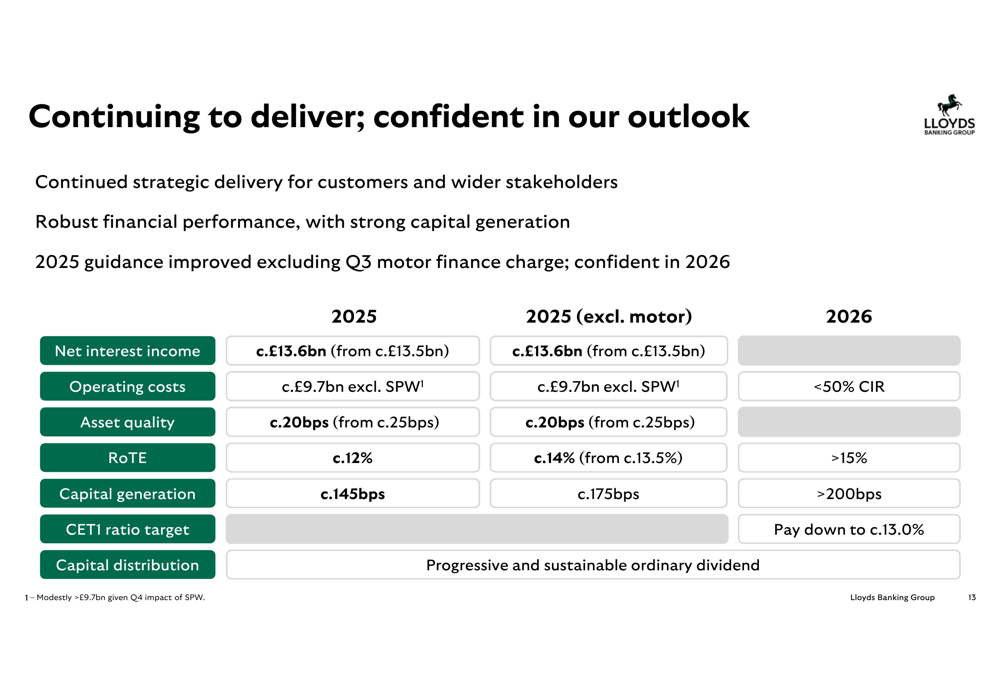 Lloyds improved its 2025 guidance for several key metrics, excluding the impact of the motor finance provision. The bank now expects: