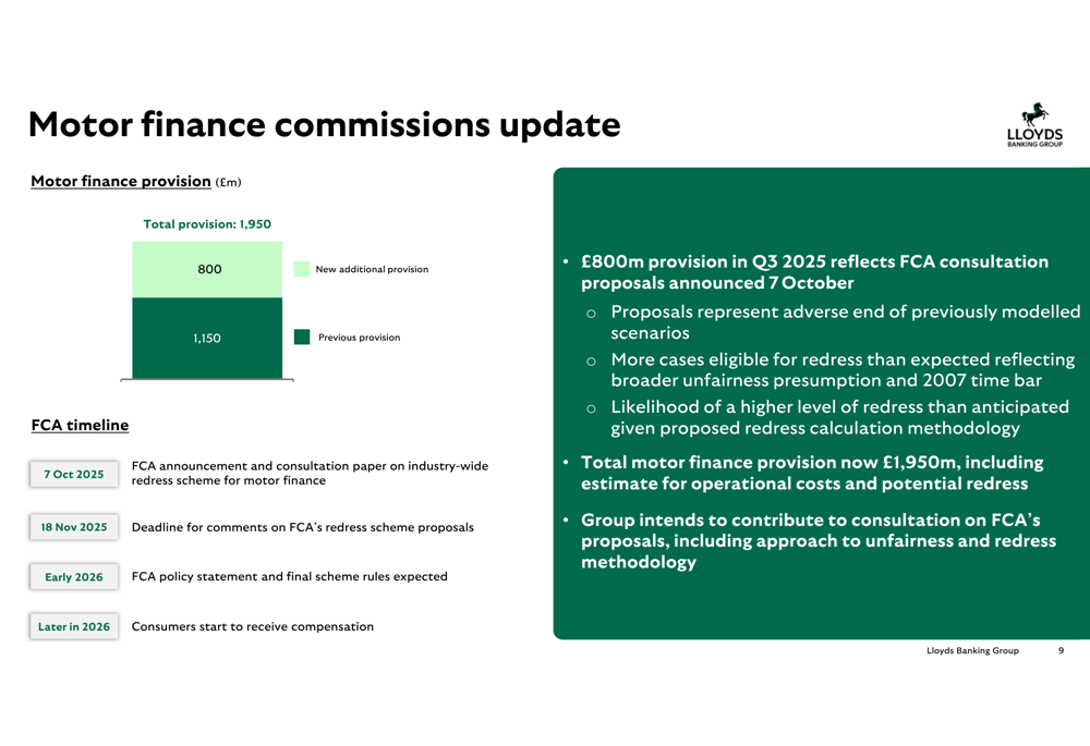 The most significant impact on Q3 results was an £800 million provision for motor finance commissions, bringing the total provision to £1.95 billion. This provision follows the Financial Conduct Authority’s consultation proposals announced on October 7, 2025, which represent the "adverse end of previously modeled scenarios" according to Lloyds.