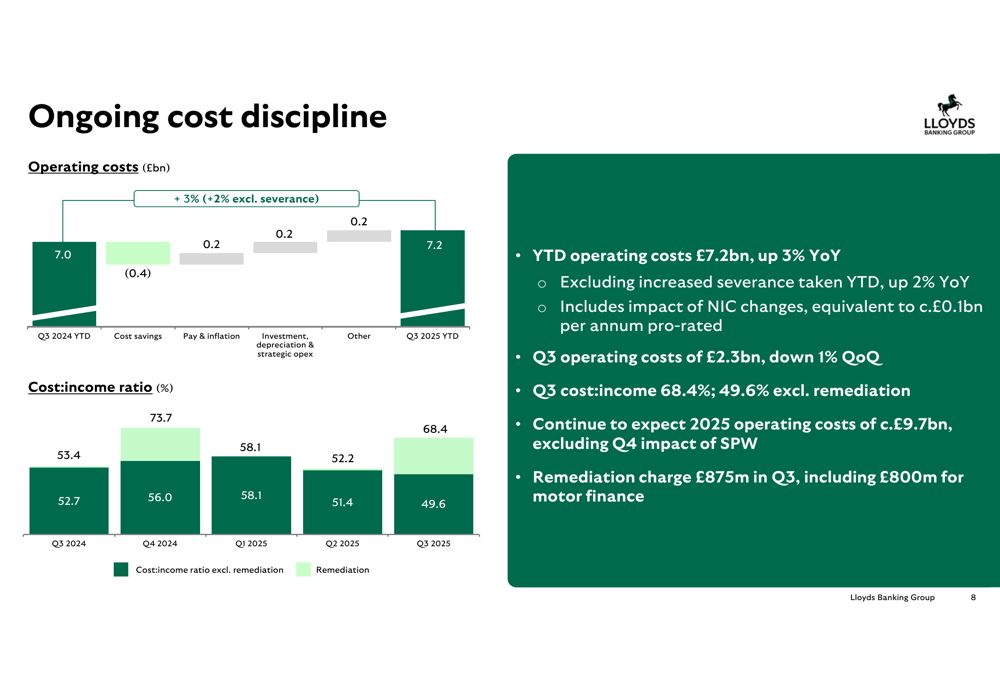 The bank maintained its focus on cost discipline, with operating costs of £2.3 billion in Q3 (down 1% quarter-on-quarter). The cost-to-income ratio stood at 68.4%, or 49.6% excluding remediation charges.