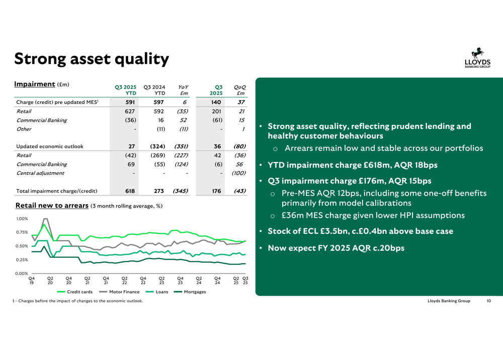 Despite this significant provision, Lloyds maintained strong asset quality across its portfolios, with a Q3 impairment charge of £176 million (asset quality ratio of 15bps). Arrears remained low and stable across the bank’s portfolios.