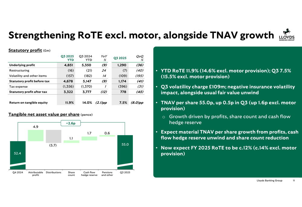 The motor finance provision significantly impacted the bank’s return on tangible equity (RoTE), which stood at 7.5% for Q3. However, excluding this provision, Q3 RoTE would have been 15.5%, demonstrating the underlying strength of the business.