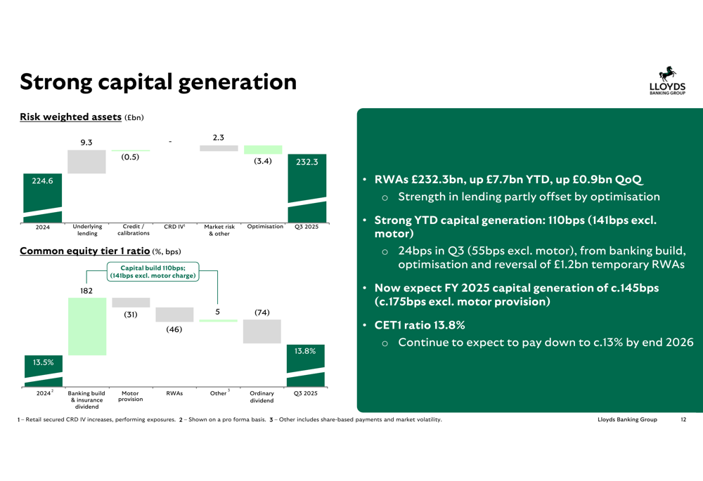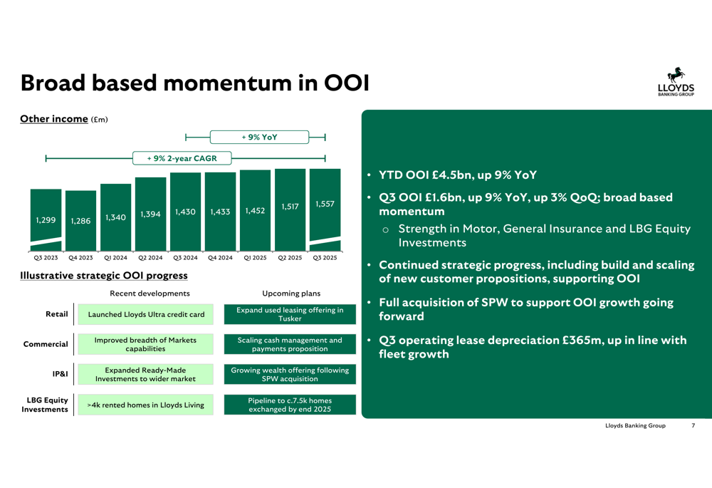 Other income also demonstrated broad-based momentum, growing to £1.56 billion in Q3 (up 3% quarter-on-quarter and 9% year-on-year). This growth was driven by strength in motor, general insurance, and LBG equity investments, as well as strategic initiatives including the launch of the Lloyds Ultra credit card and expanded ready-made investments.