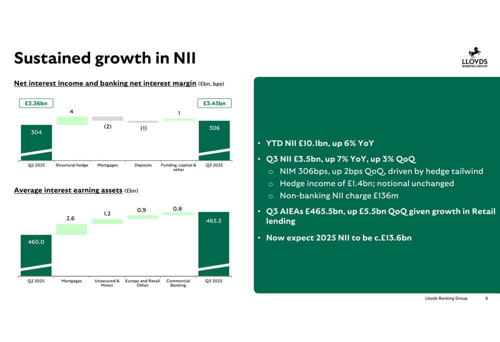 Net interest income continued its upward trajectory, reaching £3.45 billion in Q3 (up 3% quarter-on-quarter and 7% year-on-year). This growth was supported by increased average interest-earning assets, which rose to £465.5 billion in Q3 from £460.0 billion in Q2.