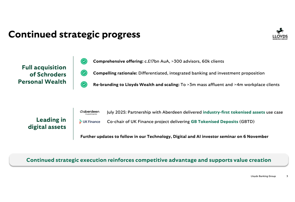 Lloyds highlighted several strategic developments in Q3, most notably the full acquisition of Schroders Personal Wealth with approximately £17 billion in assets under administration, over 300 advisors, and 60,000 clients. This acquisition aligns with the bank’s strategy to strengthen its wealth management offerings for mass affluent and workplace clients.