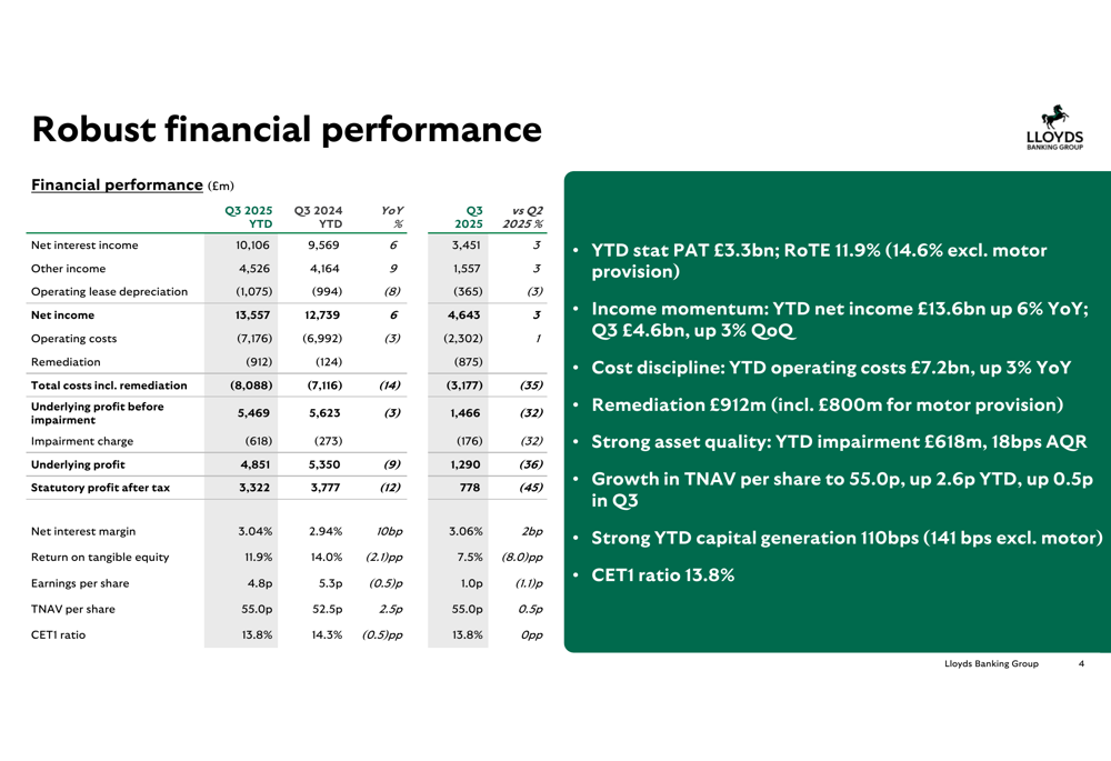 Lloyds reported Q3 2025 statutory profit after tax of £778 million, bringing the year-to-date total to £3.32 billion. The quarter’s results were significantly impacted by an £800 million provision for motor finance commissions, without which performance would have been considerably stronger.