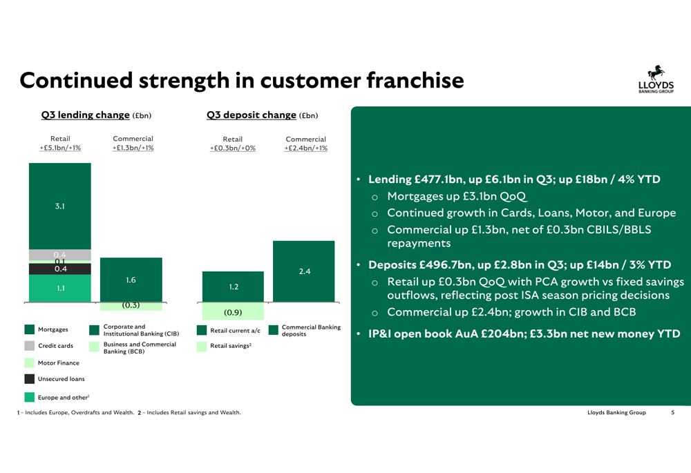 Lloyds continued to demonstrate strength in its customer franchise, with Q3 lending increasing by £6.1 billion (Retail +£5.1bn, Commercial +£1.3bn) and deposits growing by £2.8 billion (Retail +£0.3bn, Commercial +£2.4bn).