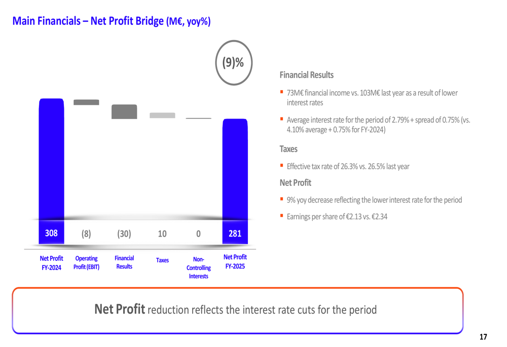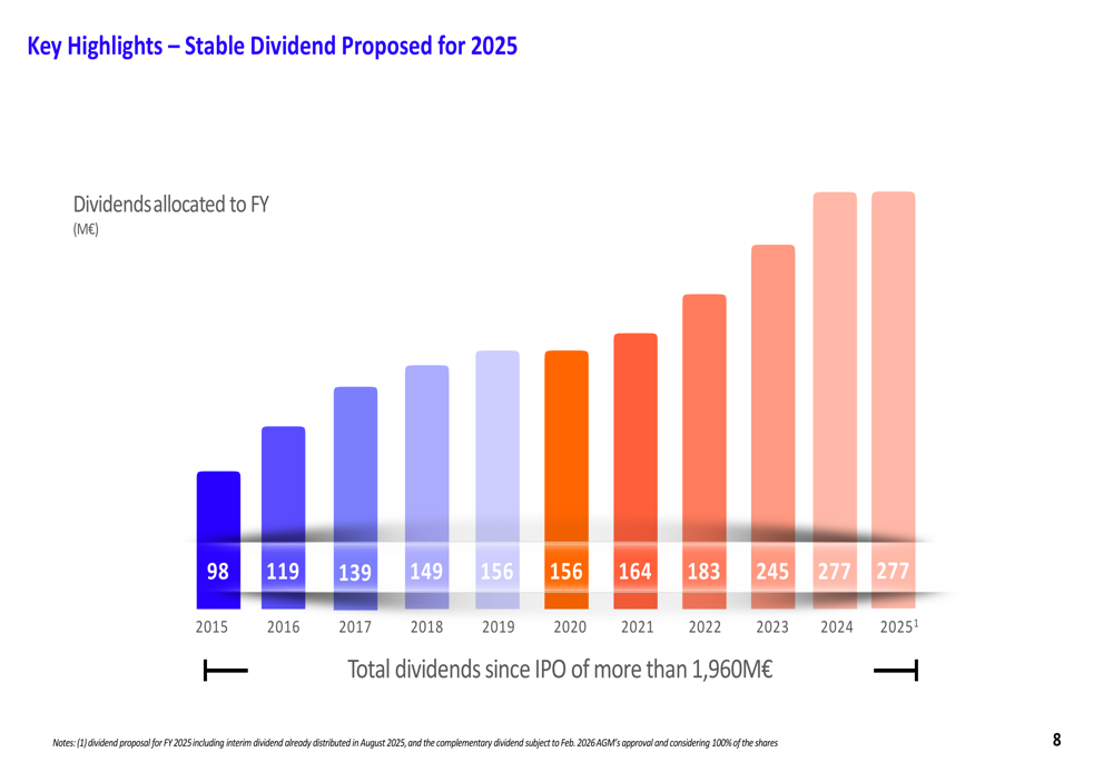 The company maintained its commitment to shareholder returns, proposing a stable dividend of €2.09 per share, representing a 99% payout ratio. This continues Logista's track record of consistent dividend growth since its IPO, with total dividends exceeding €1,960 million over that period.