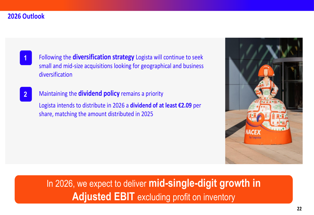 Looking ahead to 2026, Logista expects to deliver mid-single-digit growth in adjusted EBIT, excluding profit on inventory. The company plans to continue its diversification strategy through small and mid-sized acquisitions while maintaining its dividend policy.