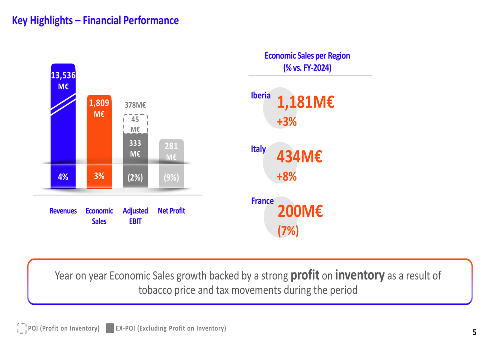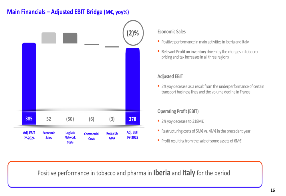 The logistics and distribution company operates primarily across Iberia, Italy, and France, facing varying market conditions in each region. While tobacco volumes declined across all markets, the company benefited from price increases and tax changes that boosted inventory profits.