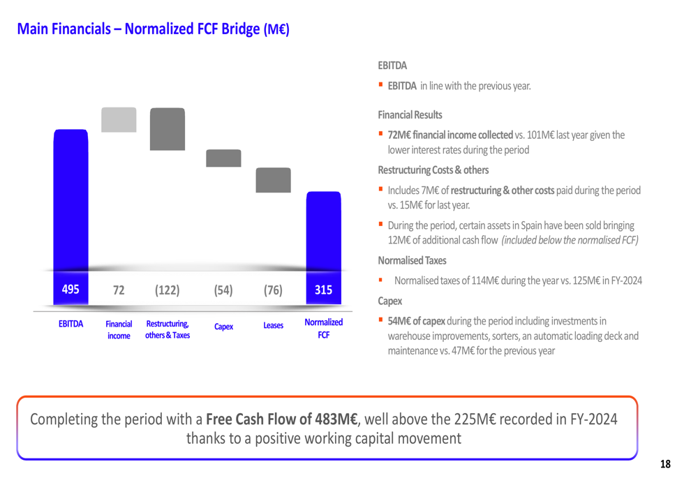 Despite these profit challenges, Logista's cash flow performance was a bright spot. The normalized free cash flow bridge shows how the company generated €315 million in normalized free cash flow, with the company ultimately achieving €483 million in free cash flow for the period:
