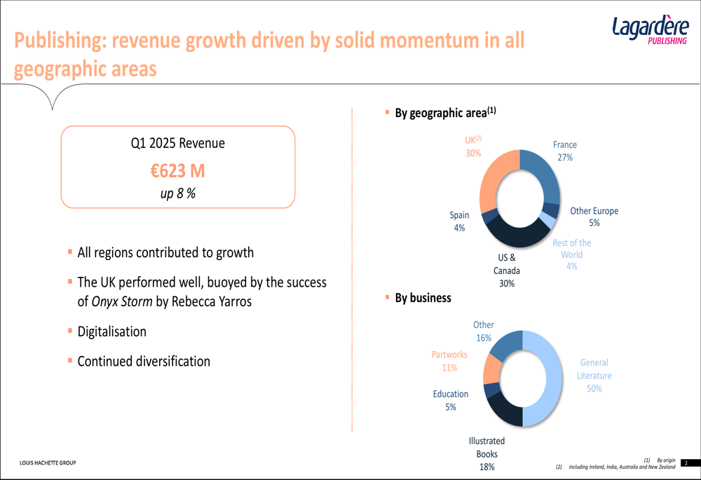 The Publishing division generated €623 million in revenue, an 8.0% increase over Q1 2024. This growth was driven by strong performance across all geographic regions, with particularly notable results in the UK market, buoyed by the success of "Onyx Storm" by Rebecca Yarros.
