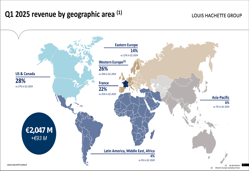 Louis Hachette Group’s Q1 2025 results reveal significant shifts in its geographic revenue distribution compared to the same period last year. The company has reduced its reliance on the French market while expanding its presence in Western Europe and Eastern Europe.