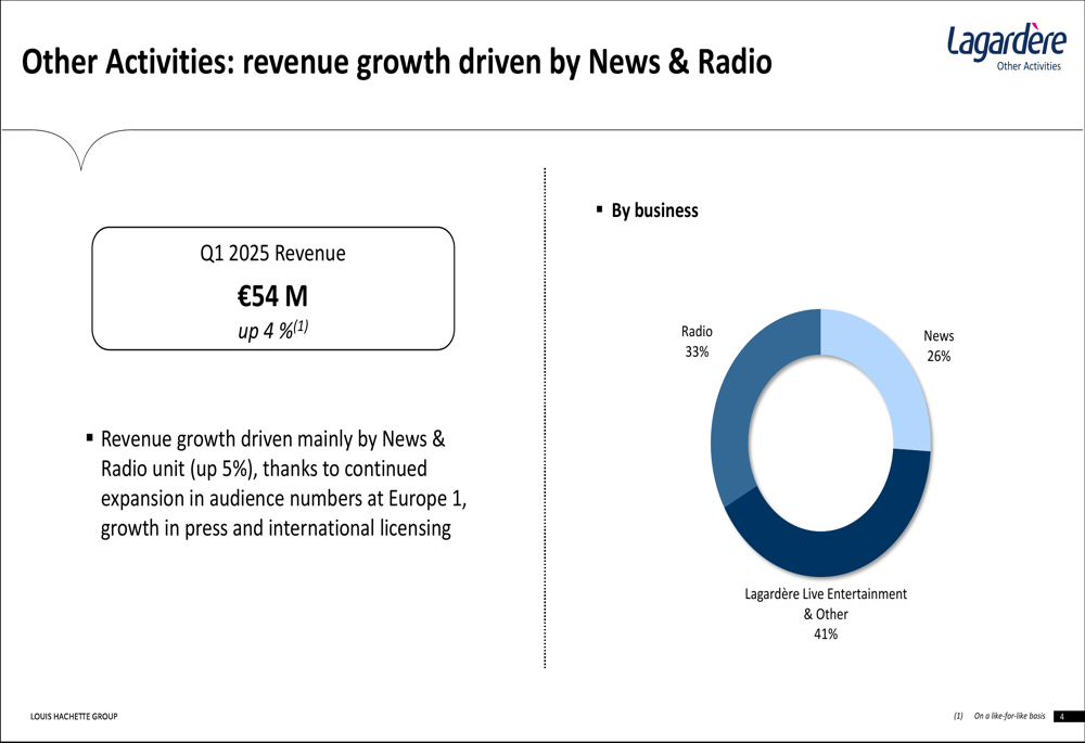 The Other Activities division reported Q1 2025 revenue of €54 million, representing a 4% increase on a like-for-like basis, despite showing a 14% decrease in reported terms. This growth was primarily driven by the News & Radio unit, which grew by 5% thanks to audience expansion at Europe 1 and growth in press and international licensing.