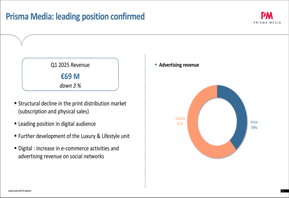 Challenges remain for Prisma Media as it navigates the structural decline in print media, though its digital transformation shows promising signs with digital now representing 61% of advertising revenue.