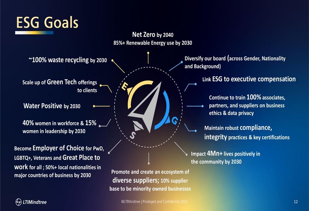 LTIMindtree has outlined ambitious environmental, social, and governance goals, including achieving Net Zero by 2040, using 85%+ renewable energy by 2030, and becoming water positive by 2030.