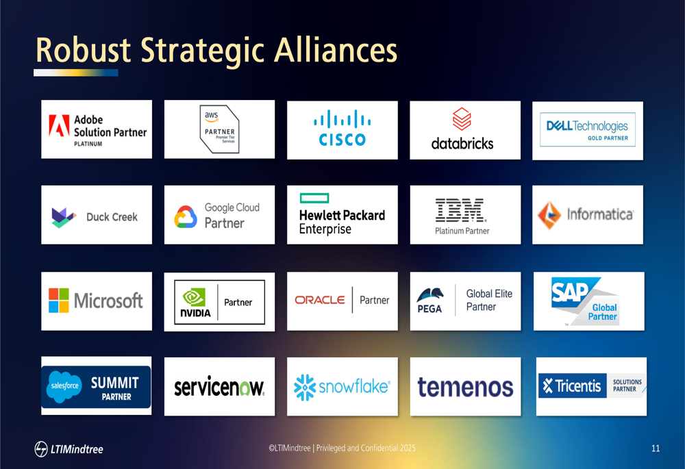 LTIMindtree’s competitive positioning is strengthened by its robust alliance network, which includes partnerships with major technology providers such as AWS, Google Cloud, Microsoft, NVIDIA, Salesforce, and ServiceNow, among others.