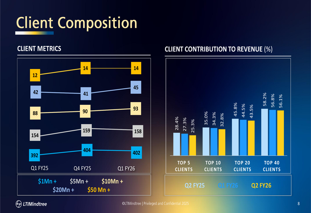 A notable positive trend is the decreasing concentration of revenue among top clients. The contribution from the top 5 clients decreased to 25.3% in Q2 FY26, down from 27.3% in the previous quarter and 28.4% year-over-year. This diversification indicates reduced dependency on key accounts and potentially more stable revenue streams.