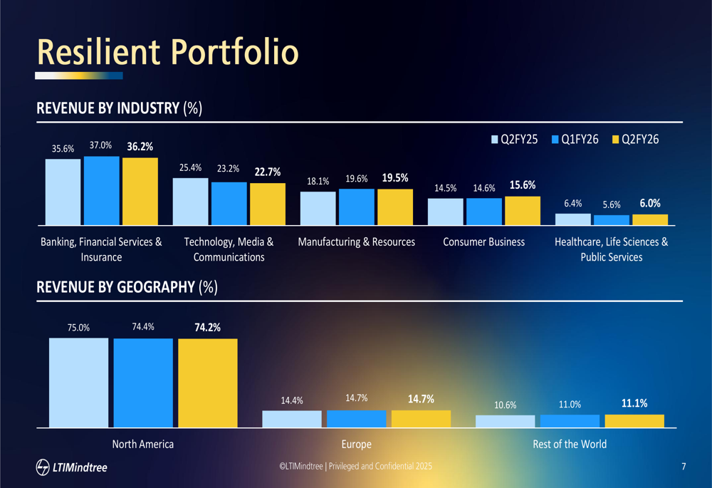 LTIMindtree’s revenue remains well-diversified across industries, with Banking, Financial Services & Insurance (BFSI) representing the largest segment at 36.2% of total revenue. Technology, Media & Communications accounts for 22.7%, while Manufacturing & Resources contributes 19.5%. The Consumer Business segment has shown growth, increasing to 15.6% of revenue in Q2 FY26.