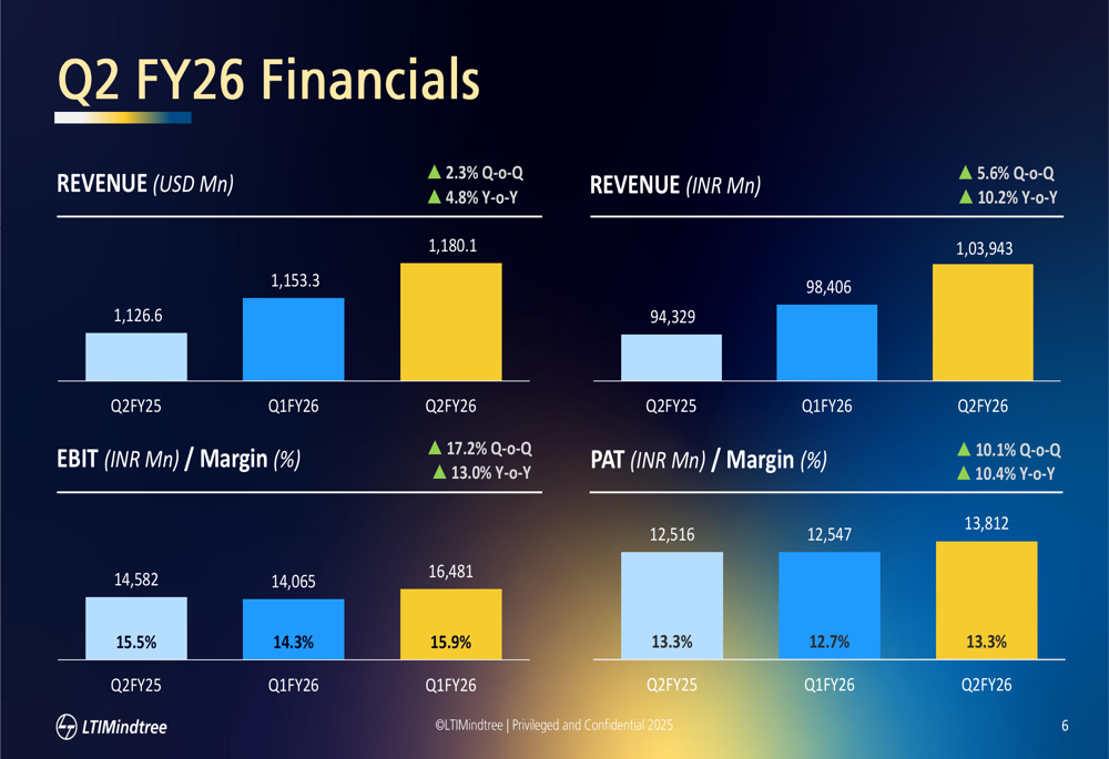 LTIMindtree reported robust financial results for Q2 FY26, with revenue reaching $1.18 billion, representing a 2.3% quarter-on-quarter increase and 4.8% year-on-year growth. In INR terms, revenue grew 5.6% sequentially to ₹103,943 million.