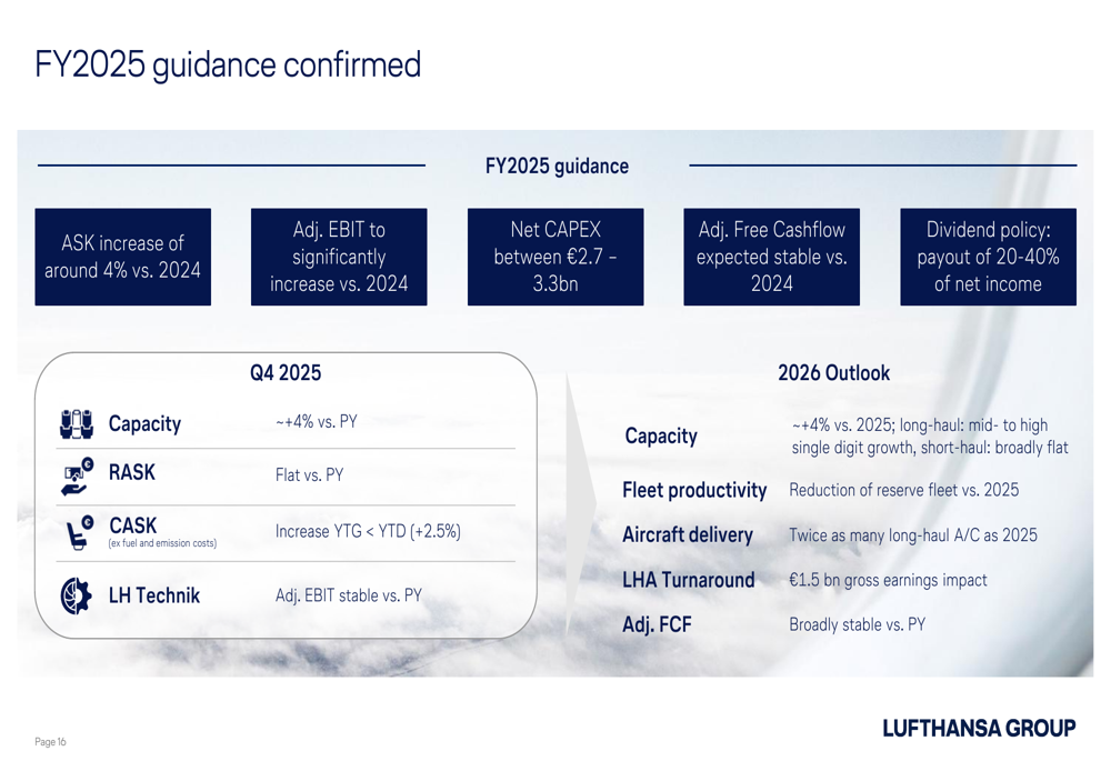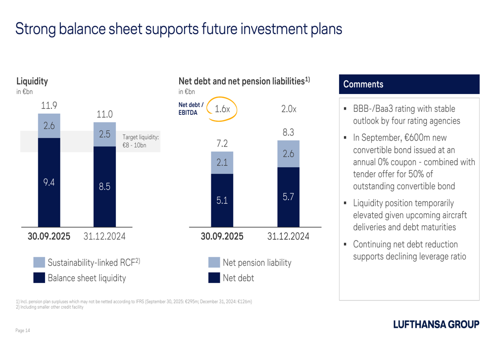 Lufthansa’s balance sheet continues to strengthen with net debt and pension liabilities decreasing to €7.2 billion as of September 30, 2025, down from €8.3 billion at the end of 2024: