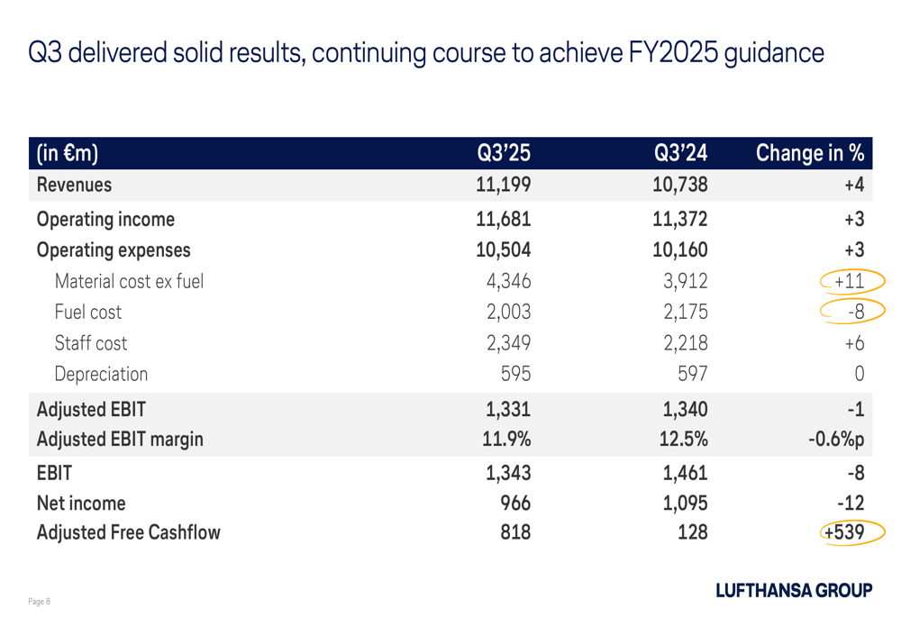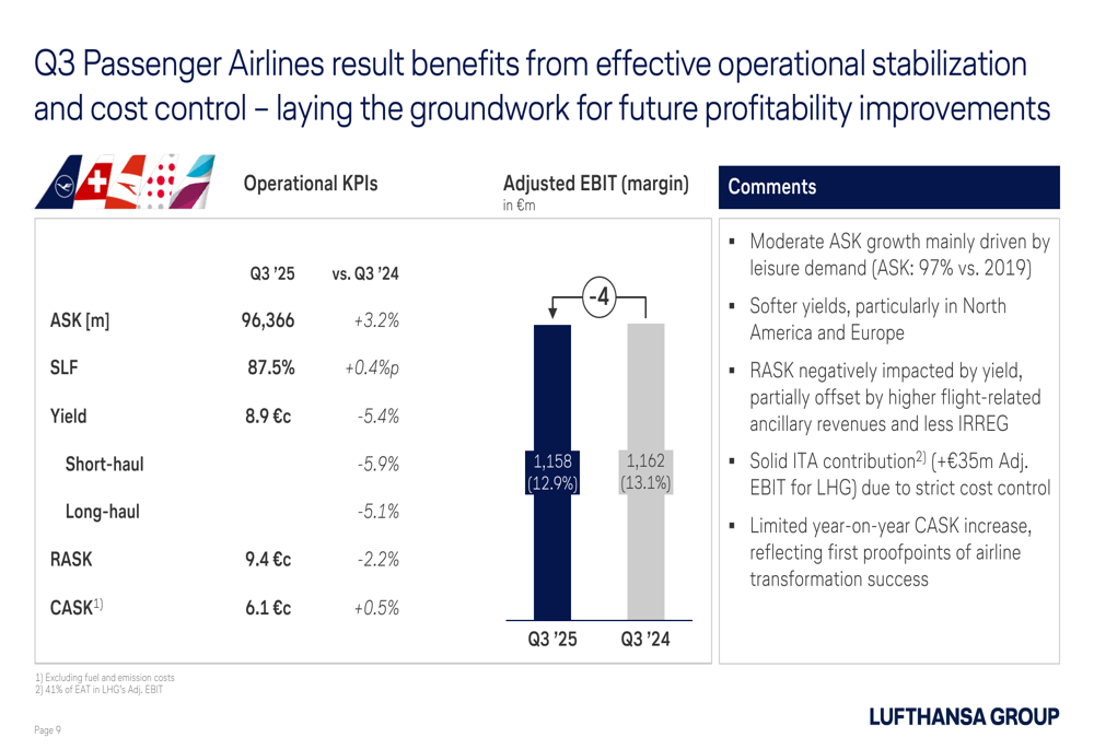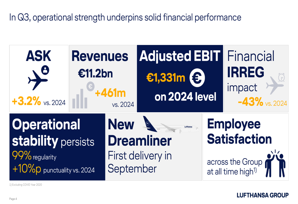 Lufthansa reported stable profitability with adjusted EBIT of €1,331 million, essentially flat compared to Q3 2024 (-1%), despite a 5.4% decline in yield. The company achieved this balance through operational improvements and cost control measures.