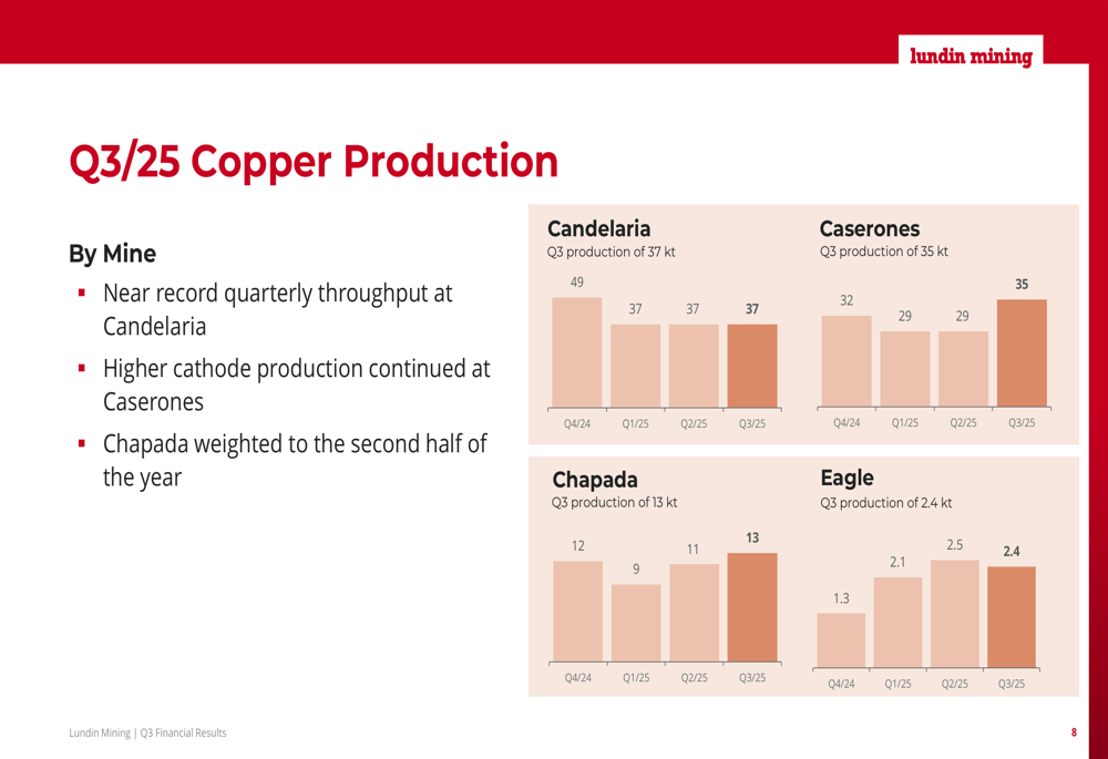 Caserones produced 35 kilotonnes of copper in Q3, up from 29 kilotonnes in Q2, while Chapada contributed 13 kilotonnes, up from 11 kilotonnes in the previous quarter. Candelaria maintained steady production at 37 kilotonnes, and Eagle contributed 2.4 kilotonnes.