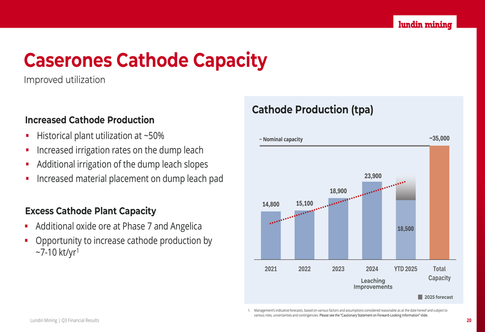 The company has significantly increased cathode production at Caserones through improved irrigation rates, additional oxide ore sources, and better material placement. Cathode production is forecast to reach approximately 35,000 tonnes in 2025, nearly double the 2023 level of 18,900 tonnes.