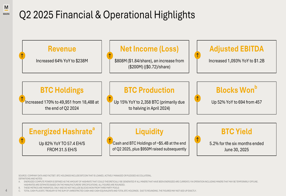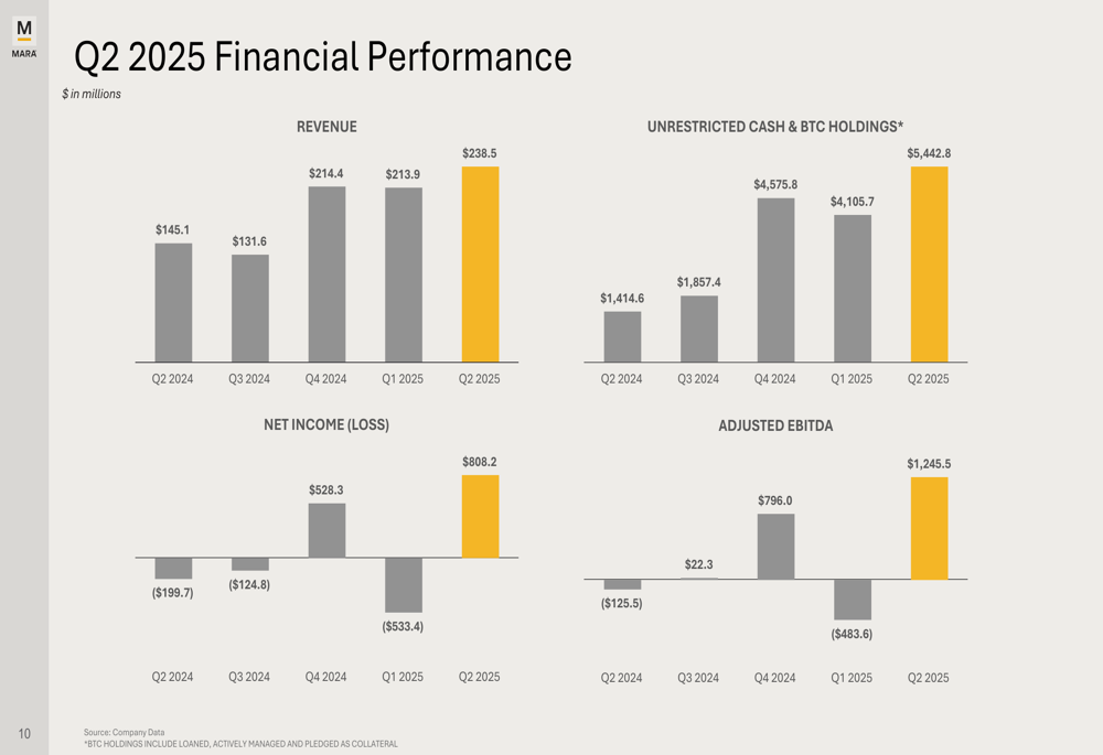 Marathon Digital achieved record financial results in Q2 2025, with revenue increasing 64% year-over-year to $238.5 million. The company reported net income of $808.2 million ($1.84 per share), a dramatic improvement from a $200 million loss ($0.72 per share) in Q2 2024. Adjusted EBITDA surged by an impressive 1,093% year-over-year to $1.2 billion.