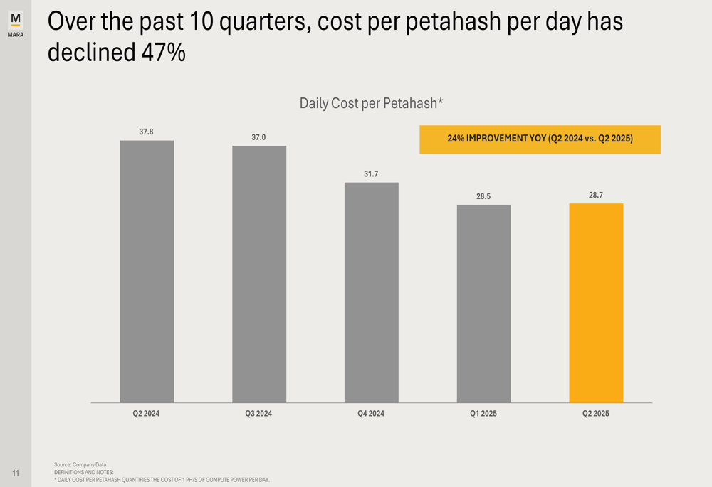 The company reported purchased energy costs per Bitcoin of $33,735, which it claims is among the lowest in the sector. This represents a continued downward trend in daily cost per petahash, which decreased 24% year-over-year: