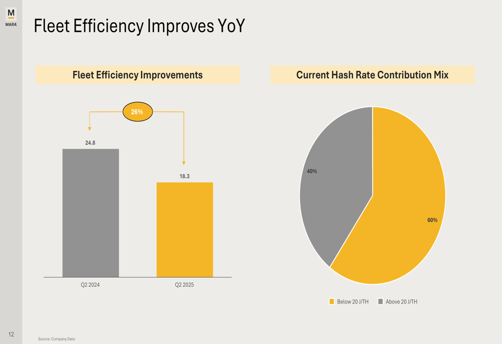 Marathon Digital emphasized significant improvements in operational efficiency during the quarter. Fleet efficiency improved to 18.3 J/TH, a 26% year-over-year enhancement driven by the deployment of S21 Pro miners: